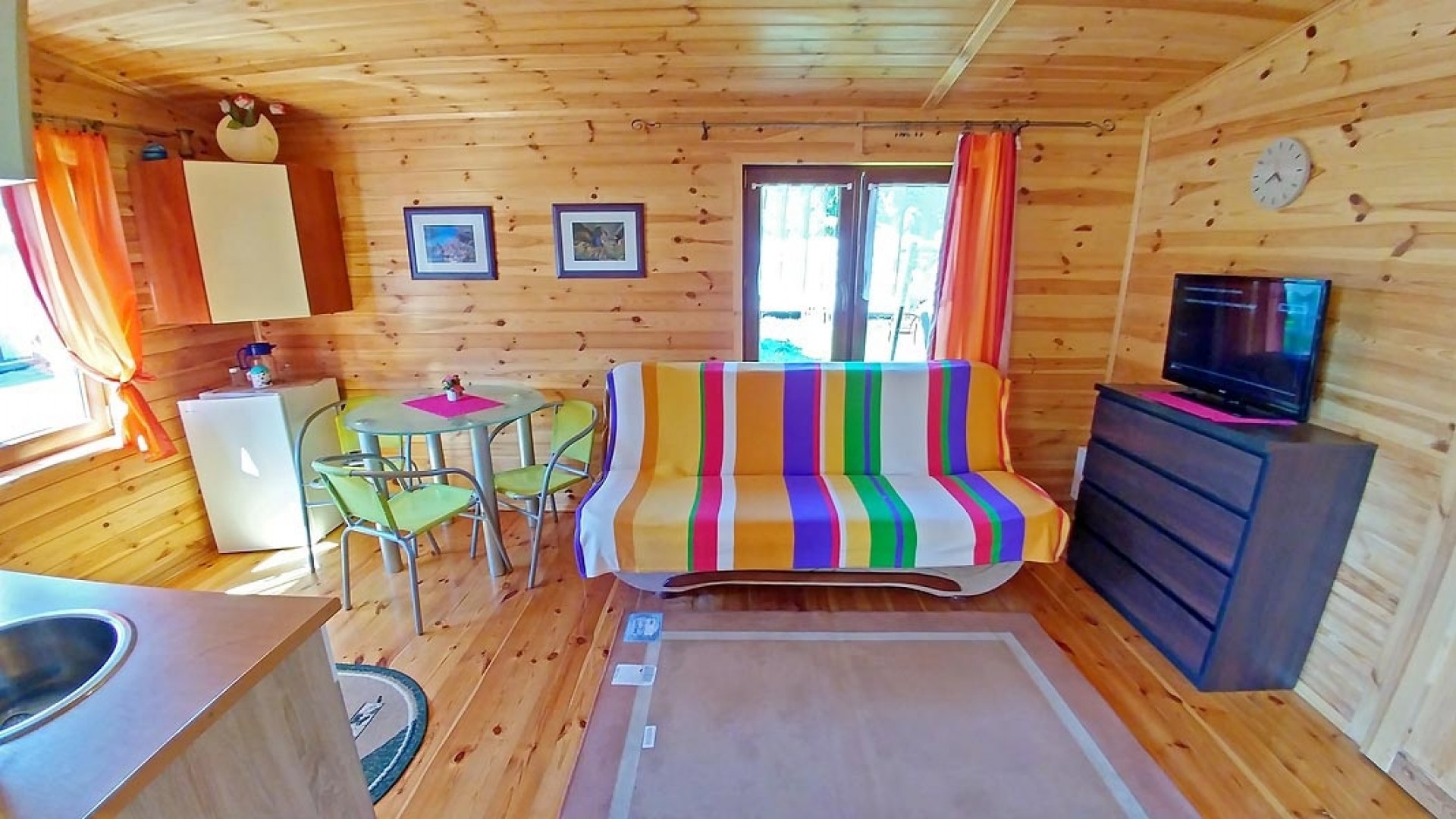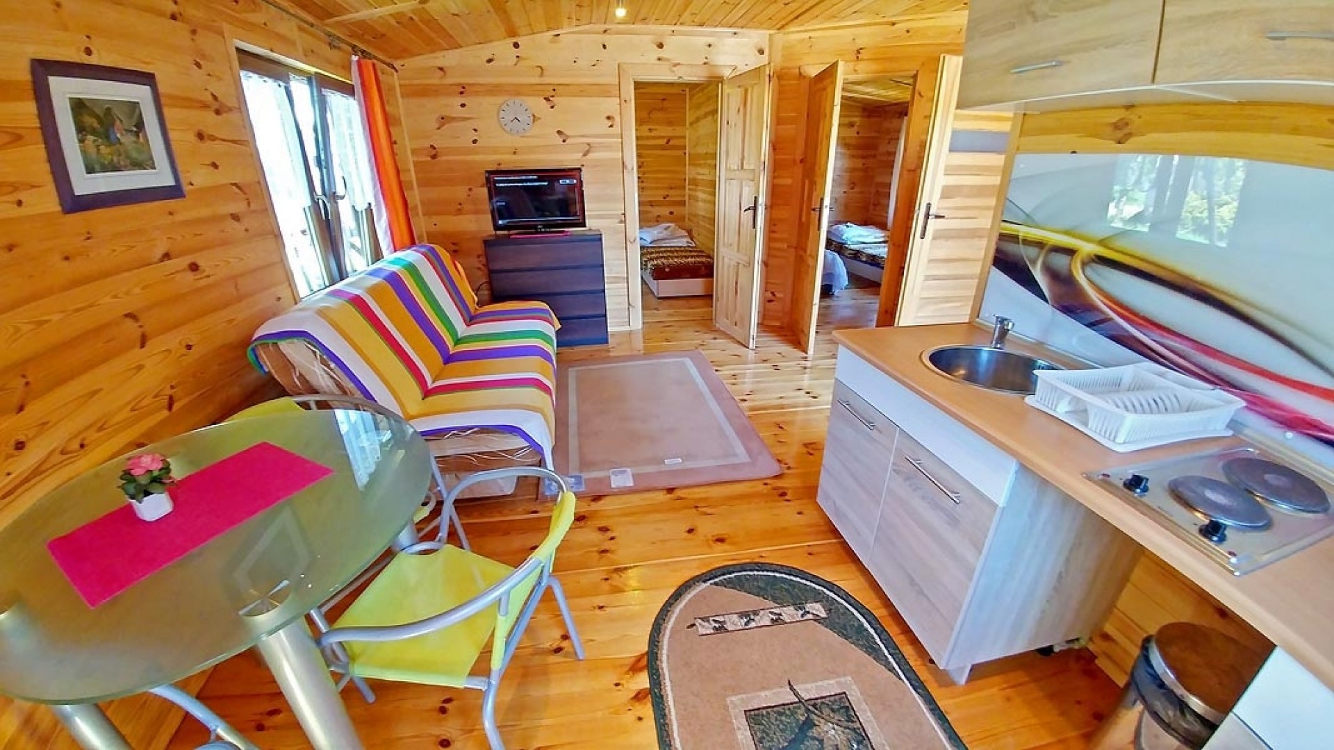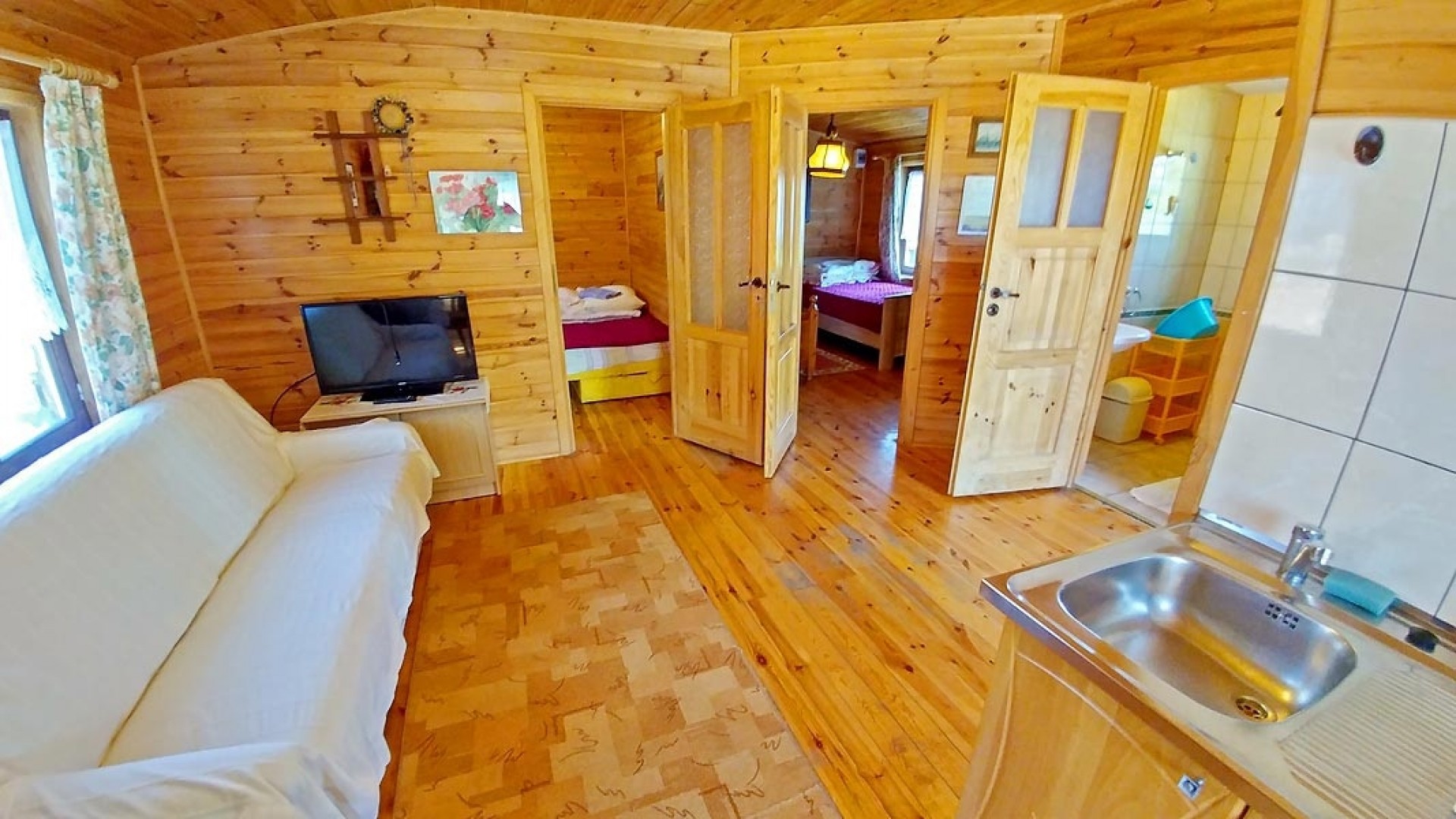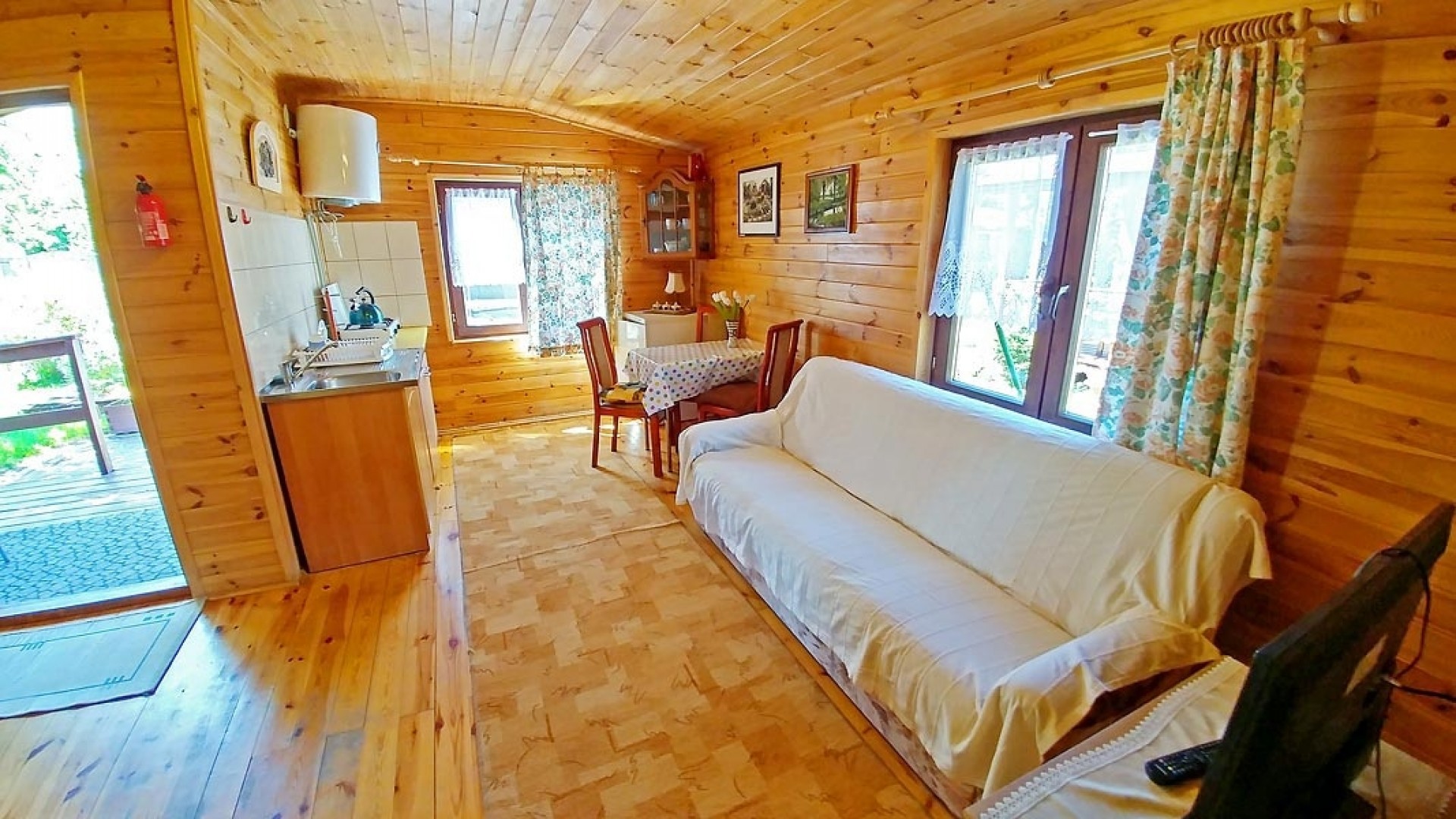 Posiadamy również domki letniskowe w pełni wyposażone - 2 sypialnie, duży salon, aneks kuchenny i łazienka.