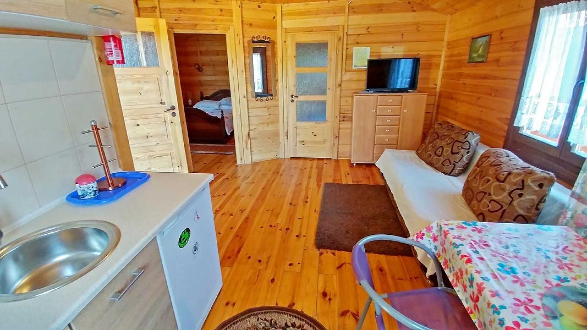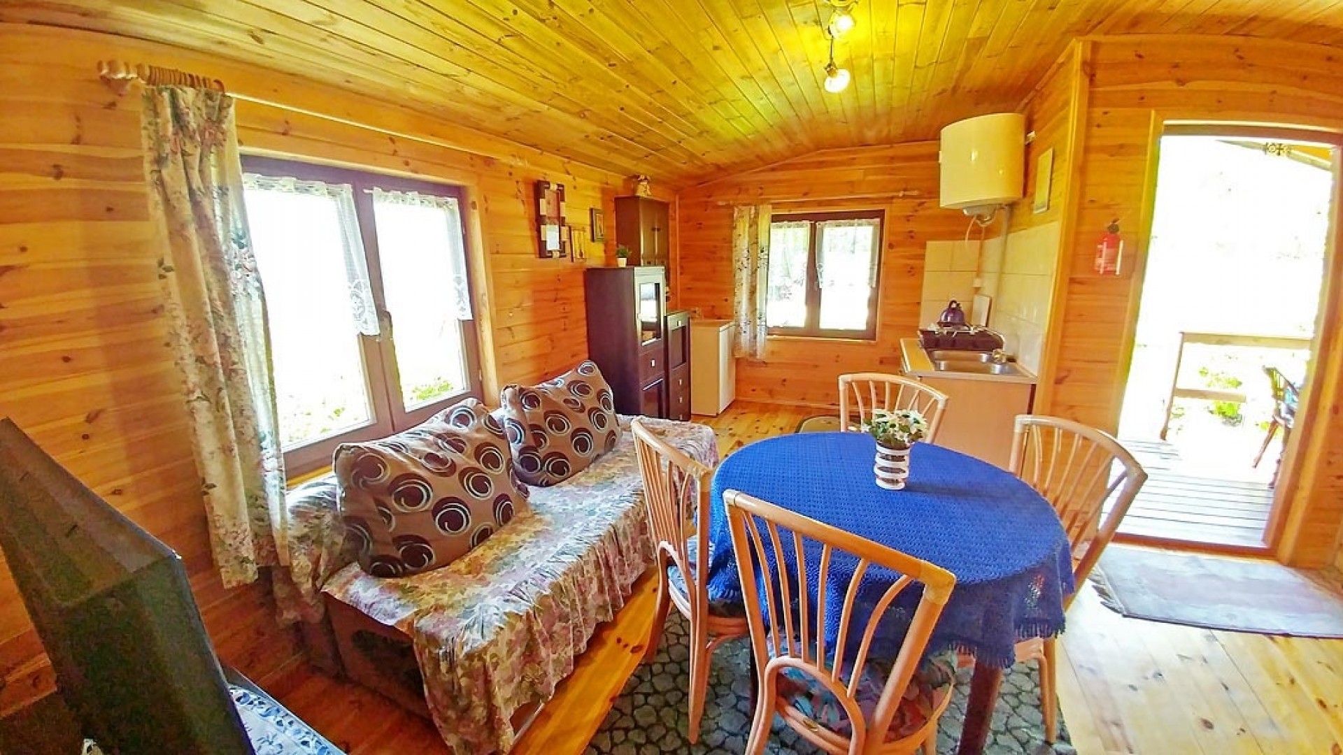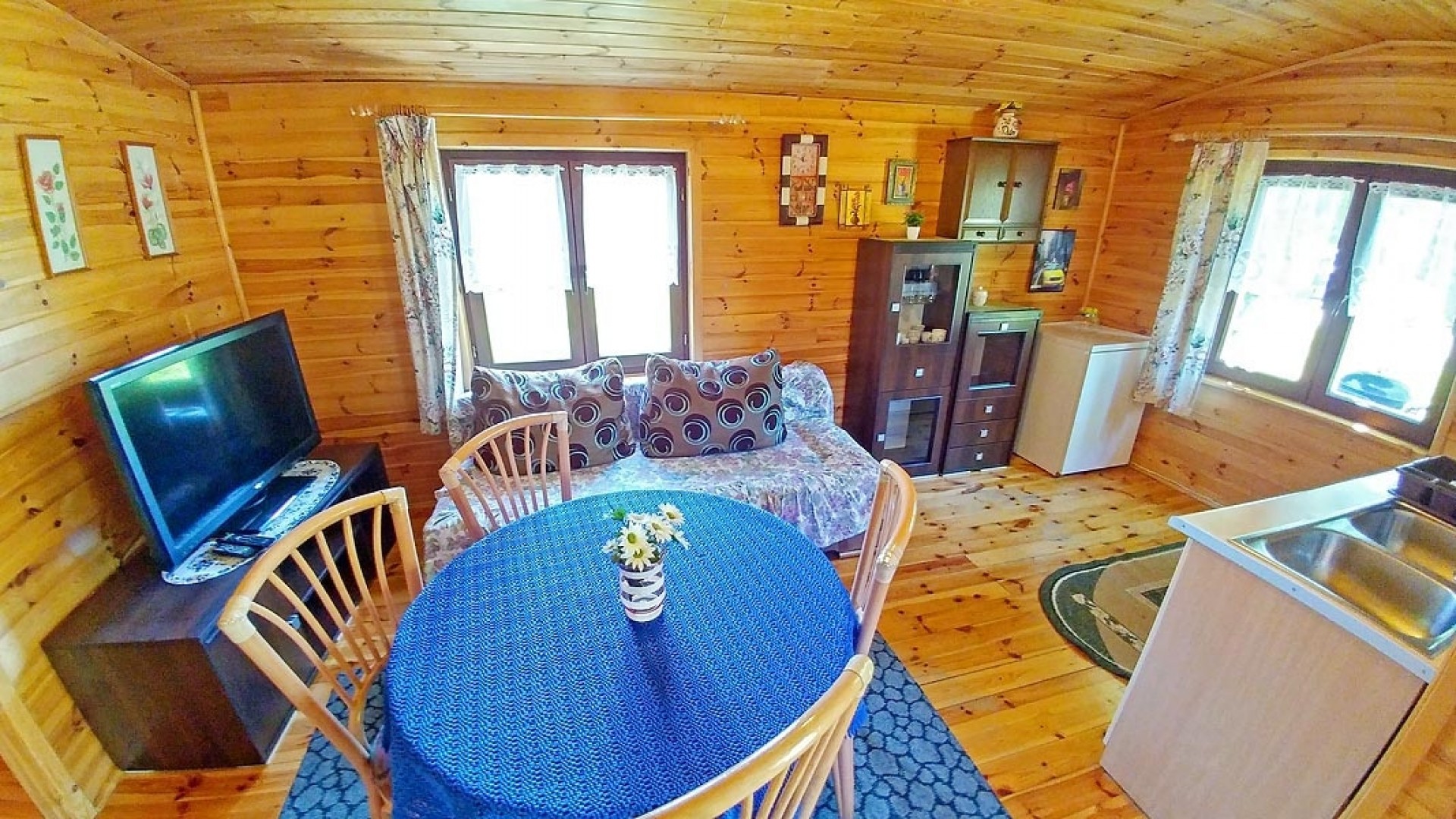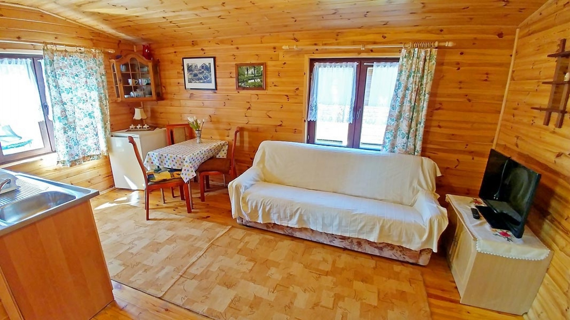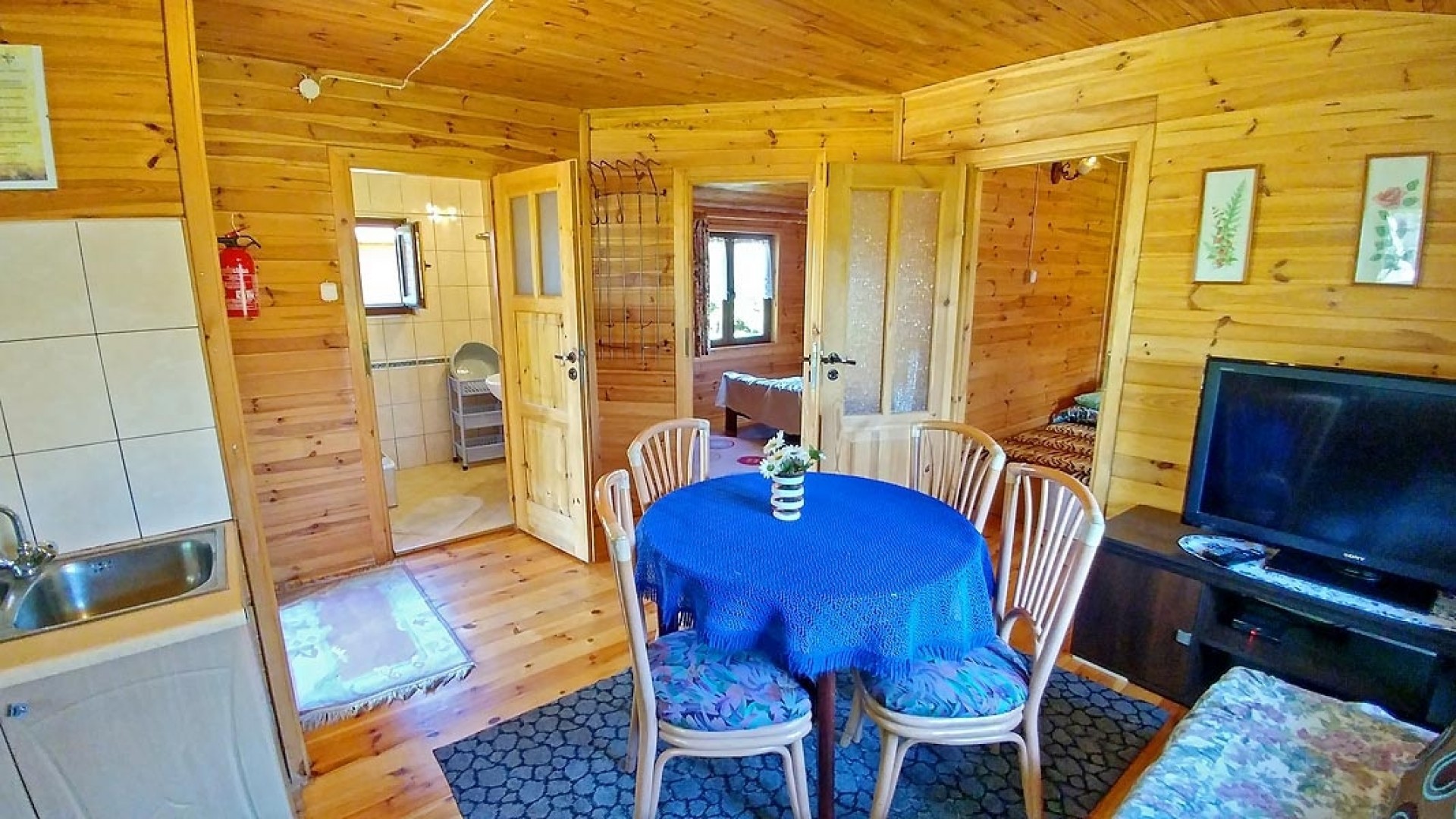 Posiadamy również domki letniskowe w pełni wyposażone - 2 sypialnie, duży salon, aneks kuchenny i łazienka.